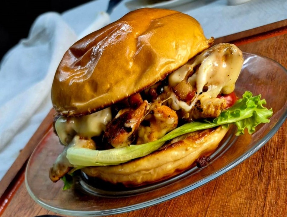Pão brioche selado na manteiga, frango bem temperado, finalizado com catupiry, bacon e uma camada de muçarela derretida por cima. |